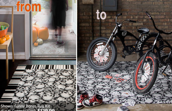 Martha Stewart have joined Flor, the maker of the coolest tile rug system, for Halloween. Arachnophobia is a spider Web pattern available in two colors. Opt for the more sophisticated Raven and Ash color. Having 9 tiles of spider web feels a little redundant. You will achieve better results if you match solid and patterned tiles to create your own unique design.