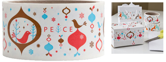 TapeSwell proposes 27 decorative packing tapes, including 7 Holiday patterns. The red and blue Pod Envelop Wrap Around tape harmoniously fit with the Bird of Peace packing tape. Also look at the Partridge of Joy Decorative Packing Tape.