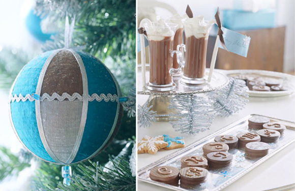 The Blue and Brown palette first caught my eyes on Better Homes and Gardens. You have to admit that the chocolate table looks inviting. The ball ornament is a do-it-yourself project. You simply dress up plastic foam ornaments with scraps of blue and brown fabric. Add silver ribbons and a few beads for elegance.