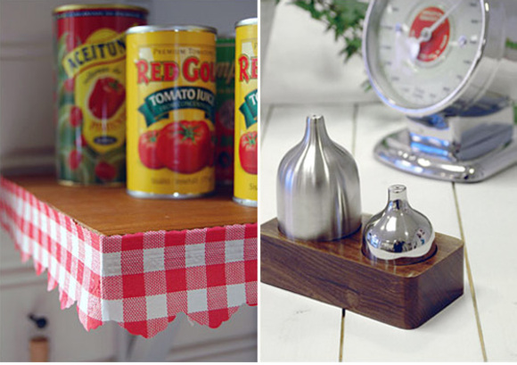 The red shelf edge paper would deliver a charming old-fashioned look for an apple pie station or a bake sale. Then, the stainless steel salt and pepper set from Define has modern line. They stand on their own outside the rosewood tray.