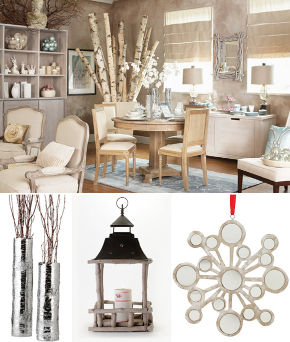 With smaller urban homes and unit condos, many people do not have the space to keep tons of decorations that they use one month a year. Look at items that you can reuse instead. Simply replace the white and red candle on the twig lantern and enjoy it all summer at the cottage. The silver twig vase, I saw similar ones at William Ashley by the way, could be used any time you entertain to add sparkle to your dining room. I might keep one or two white deer statutes on a shelf after Christmas.