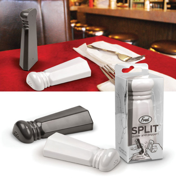 + The Split shaker can save you time if like by pouring salt and pepper at the same time. For the less adventurous, you can divide the Split shaker in 2 and used each side separately. Hidden magnets keep the 2 halves together.