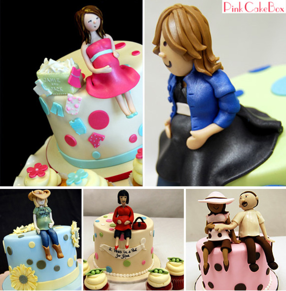 August 30, 2009 at 11:26These cakes are over the top cute. I wish I knew how to make fondant just to surprise someone with a cool cake. I love the pregnant girl in pink.