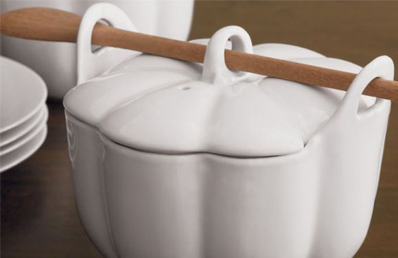 The Pumpkin tureen does not scream Halloween. Being white and its updated treatment means that you can use it anytime during the autumnal season. The wood pumpkin trivet adds a trendy touch to family style food service.
