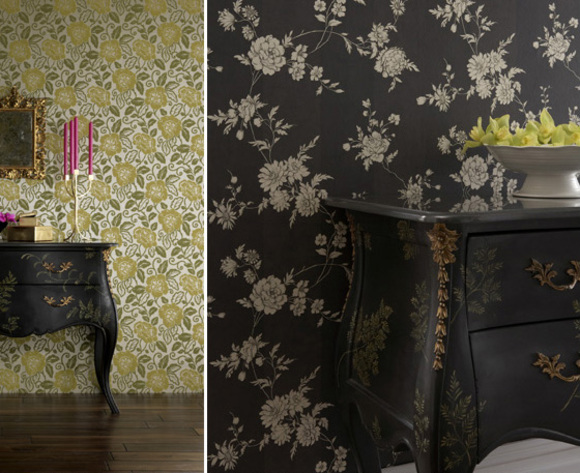 More great wallpapers are produced by Arthouse. The blue and silver Divine paper at the top is an eco-friendly wallpaper made from recycled paper and water-based inks in factories that have environmental improvement policies in place. The yellow paper is the Radiance pattern from the Vintage collection. They are both equally pleasing to the eye.