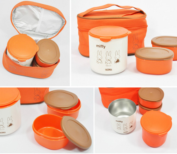 First, the Poka Poka Miffy set. Miffy is a popular female rabbit character from a picture kid book drawn by Dutch artist and illustrator Dick Bruna. This Bento set was designed to keep rice warm. For a breakfast on the park, you could carry warm oat meal or beans. A stainless steel Thermos box painted with Miffy, two small boxes and an insulated bag form this adorable set.