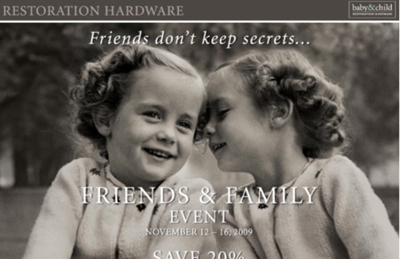 Wait a couple of days since from Thursday, November 12 through Monday, November 16, shoppers can receive a 20% off discount for Restoration Hardware and Restoration Hardware Baby & Child merchandise. Discount code for catalog and web orders: FFS2009.